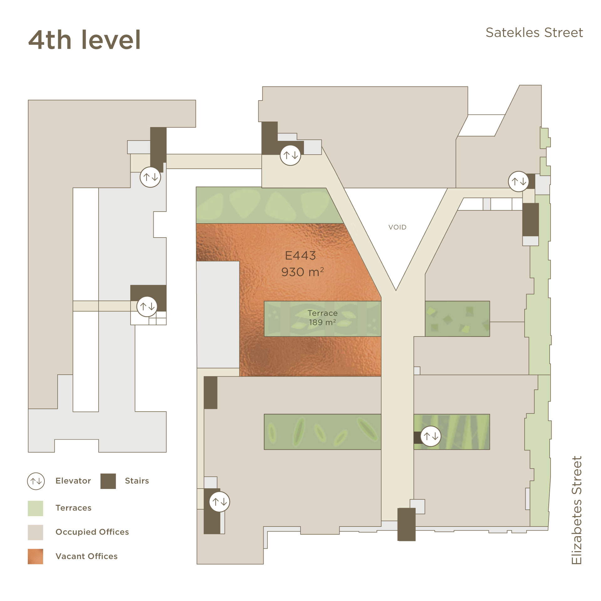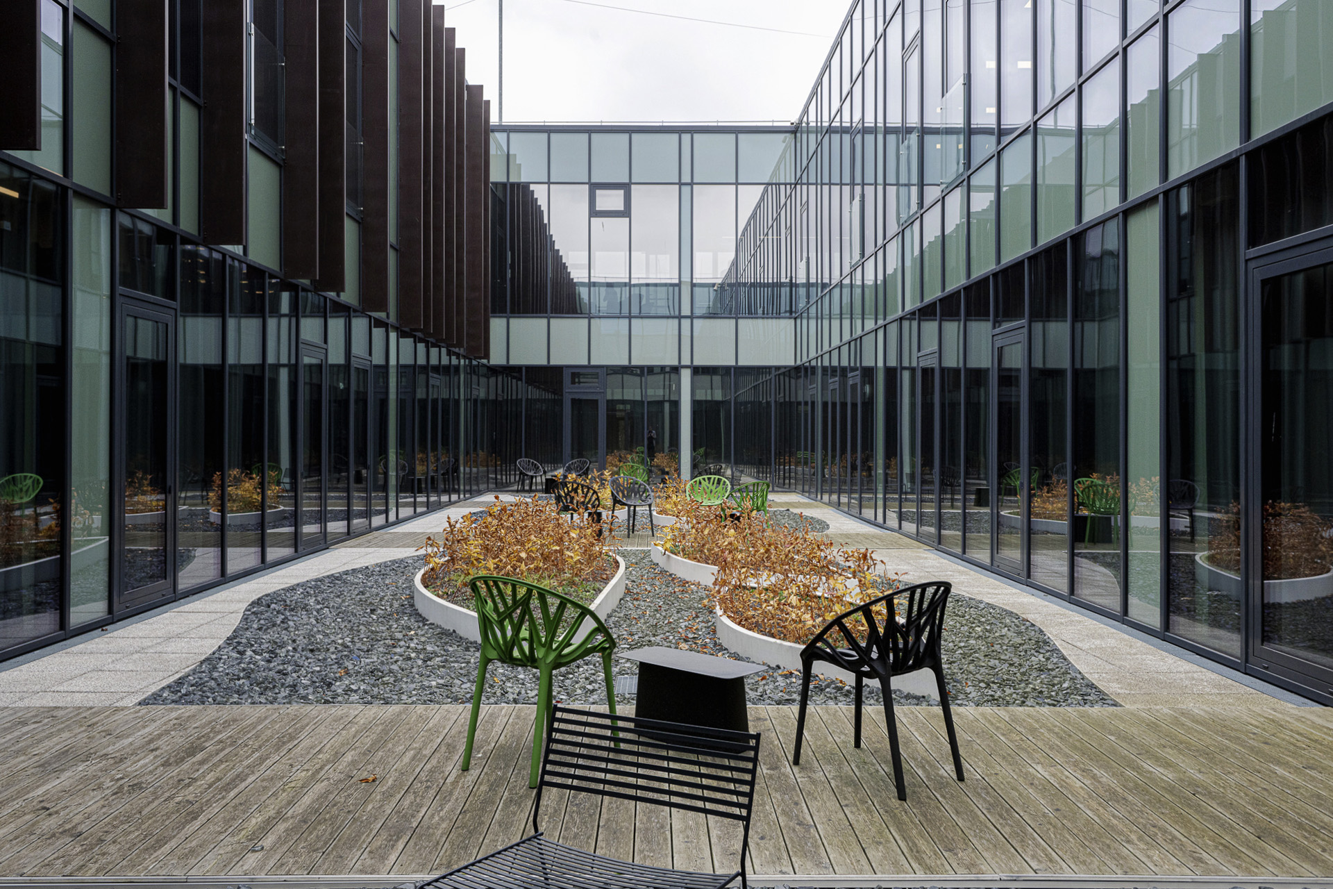 Terases:Divas terases – koplietošanas un privāta atklātā zaļā terase, kas nodrošina darbinieku labsajūtu, samazinot stresu, palielinot produktivitāti un veicinot radošumu.