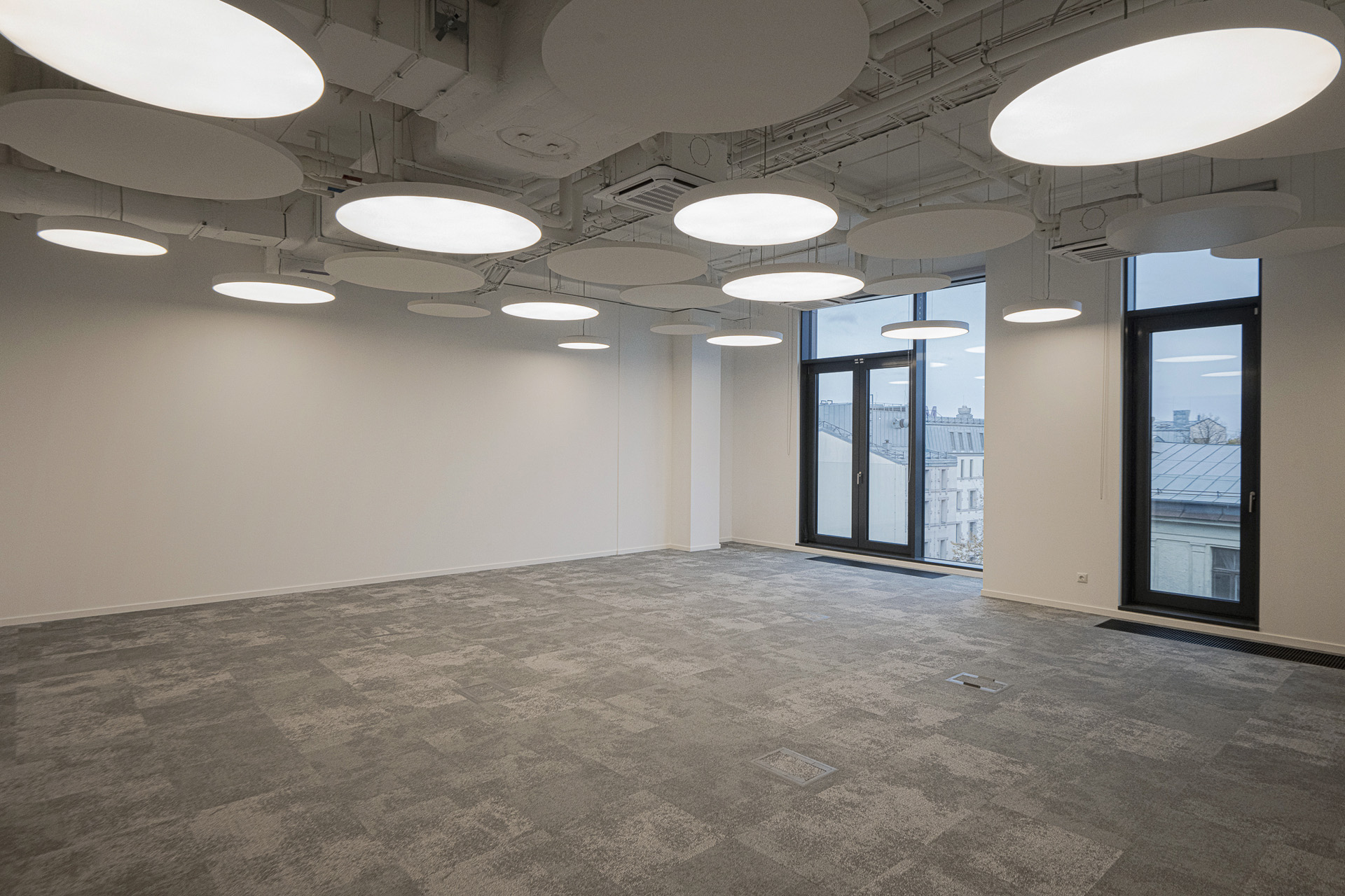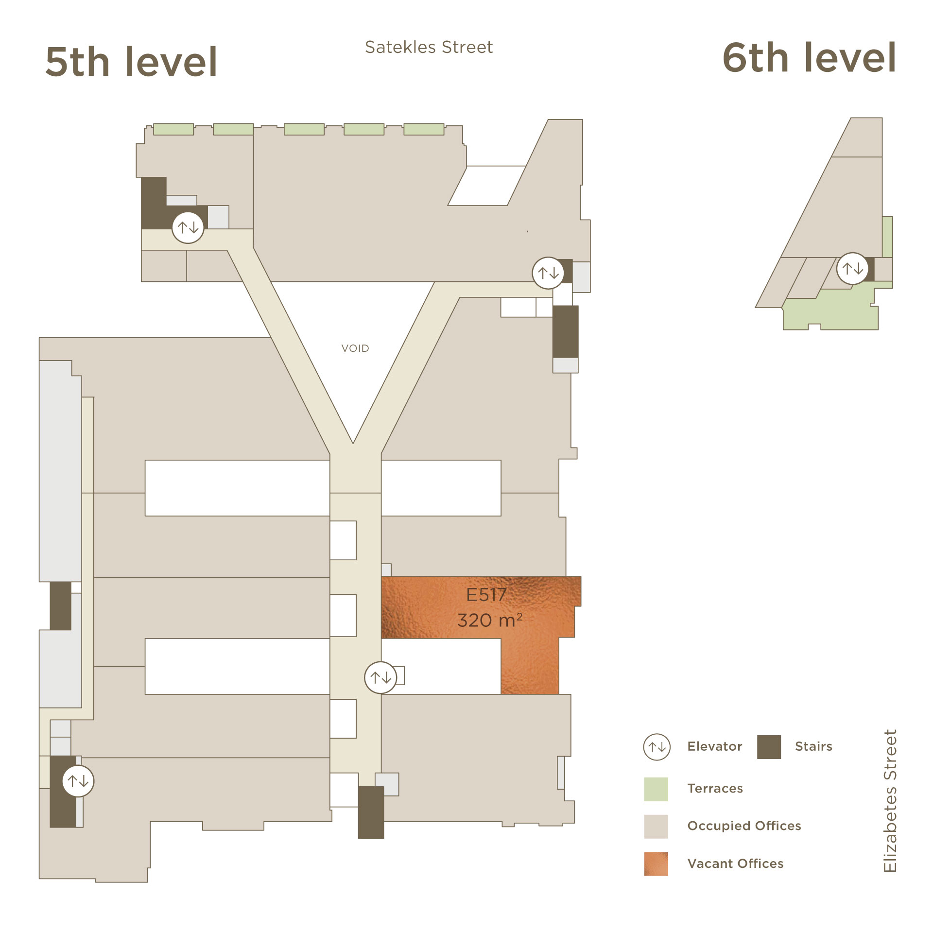 Biroja telpas:Elastīgs un pielāgojams telpu plānojums. Telpas nav mēbelētas. Flīžu / mīkstais grīdas segums. Ir pieejama izbūvēta virtuve. Individuāls sanitārais mezgls. Gaišas telpas ar lieliem logiem, kas tās piepilda ar dabisko dienas gaismu. Logi vērsti gan uz 4. stāva terasi, gan uz Elizabetes un Kļavu ielām ar skaistu panorāmu.